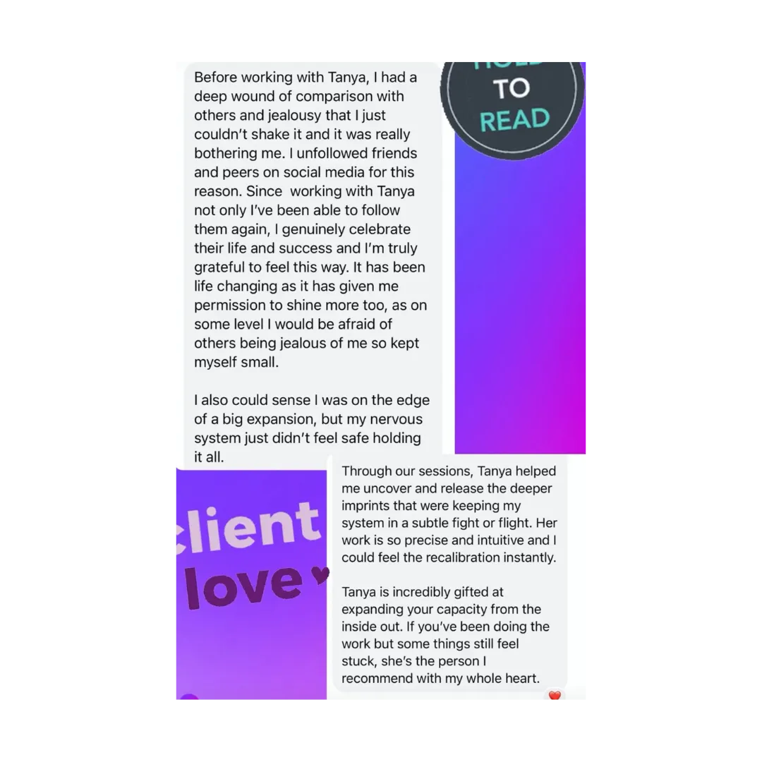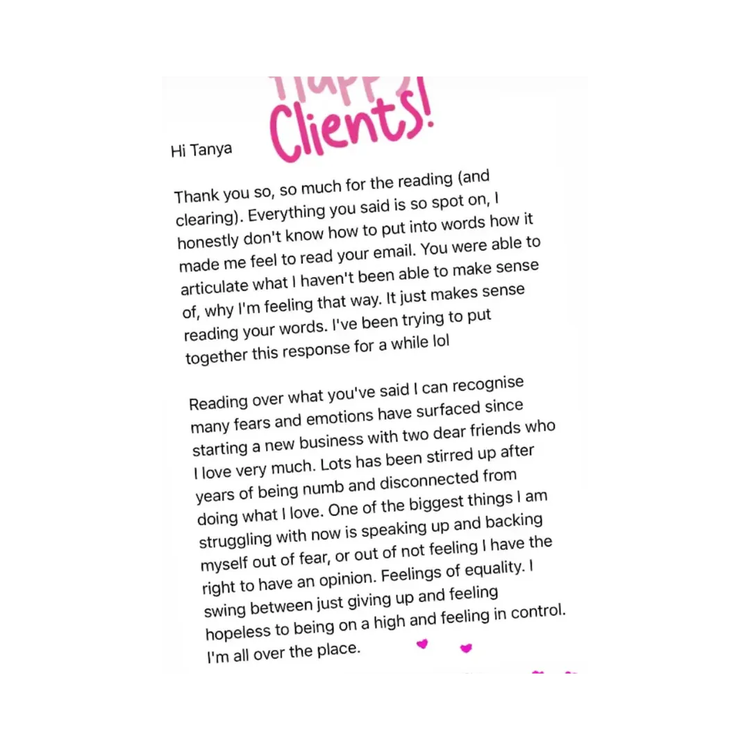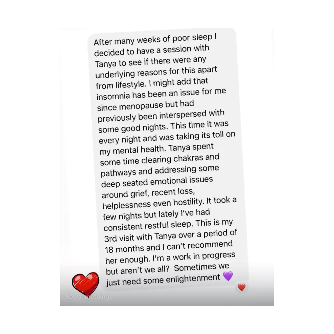 "I had a session with Tanya a few months ago and she picked up on so many things that only I know and no one else. I had a lot of stuck energy and limiting beliefs and they were cleared instantly. The whole session was mind blowing, plus so many other physical benefits such as no hair loss anymore. Lots of things balanced within my body but also manifestations we’re coming right left and centre as she cleared lots of stuck energy I was carrying on me."