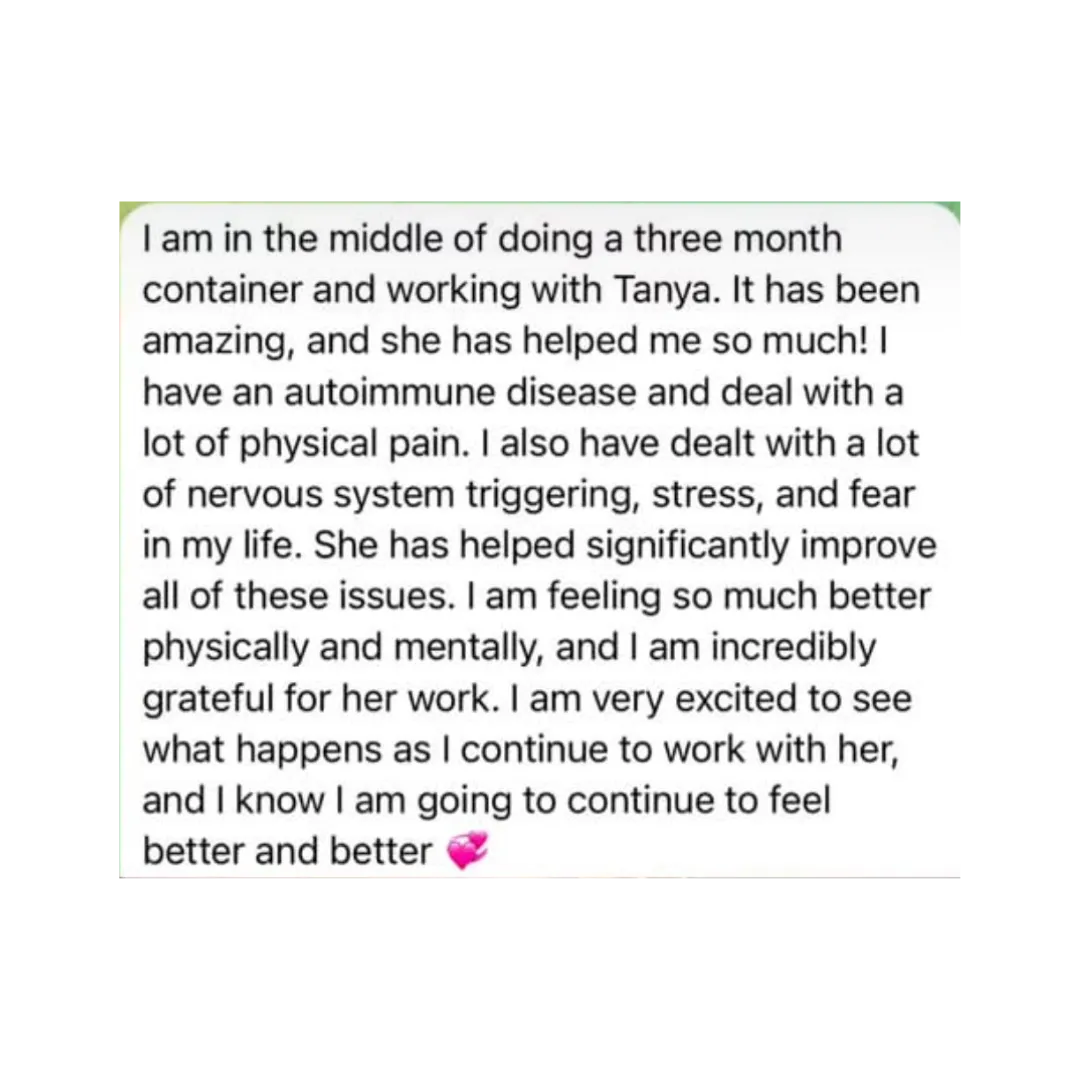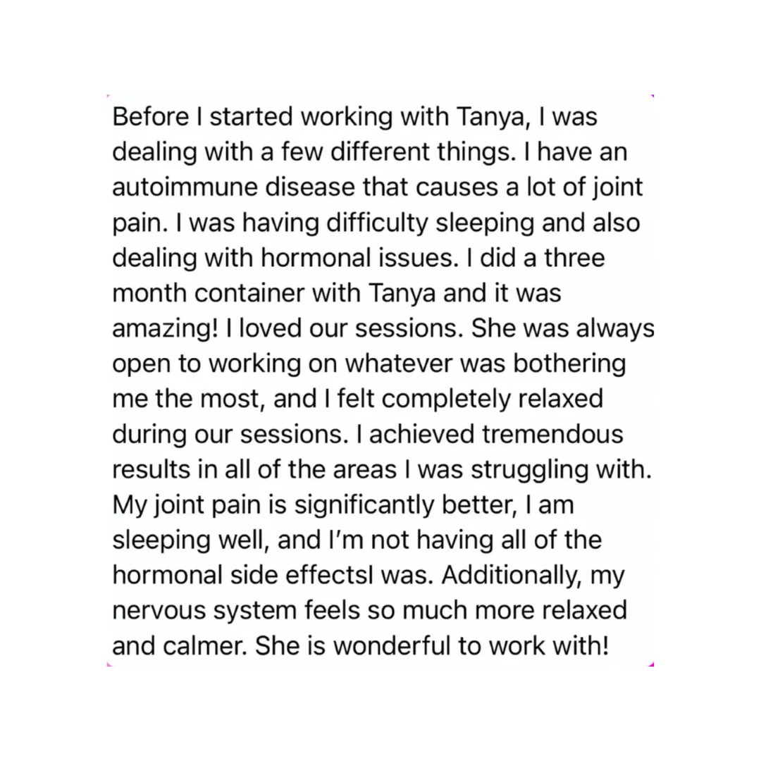 "I’ve been seeing Tanya over the last 3 years for Kinesiology and energy work, she’s just Amazing! Her talent and skill are equal to her depth, insight and guidance in energetic alignment. Tanya creates a warm, safe environment with follow up aftercare that is rare these days. Her genuine passion for her work & client wellbeing, is the first thing you notice. You will emerge more aligned & clearer in her skilled hands 🙏🏼✨"
